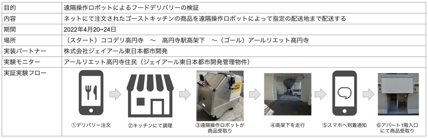 当日は、「アールリエット高円寺」のモニターユーザーが注文したゴーストレストラン「ココデリ高円寺」の商品を、Yper株式会社の遠隔操作配送ロボットを大阪から遠隔操作を行い、高円寺の高架下道路や公道を走行し、指定の住宅まで配送。実証実験の背景や目的、当日の様子を報告します。